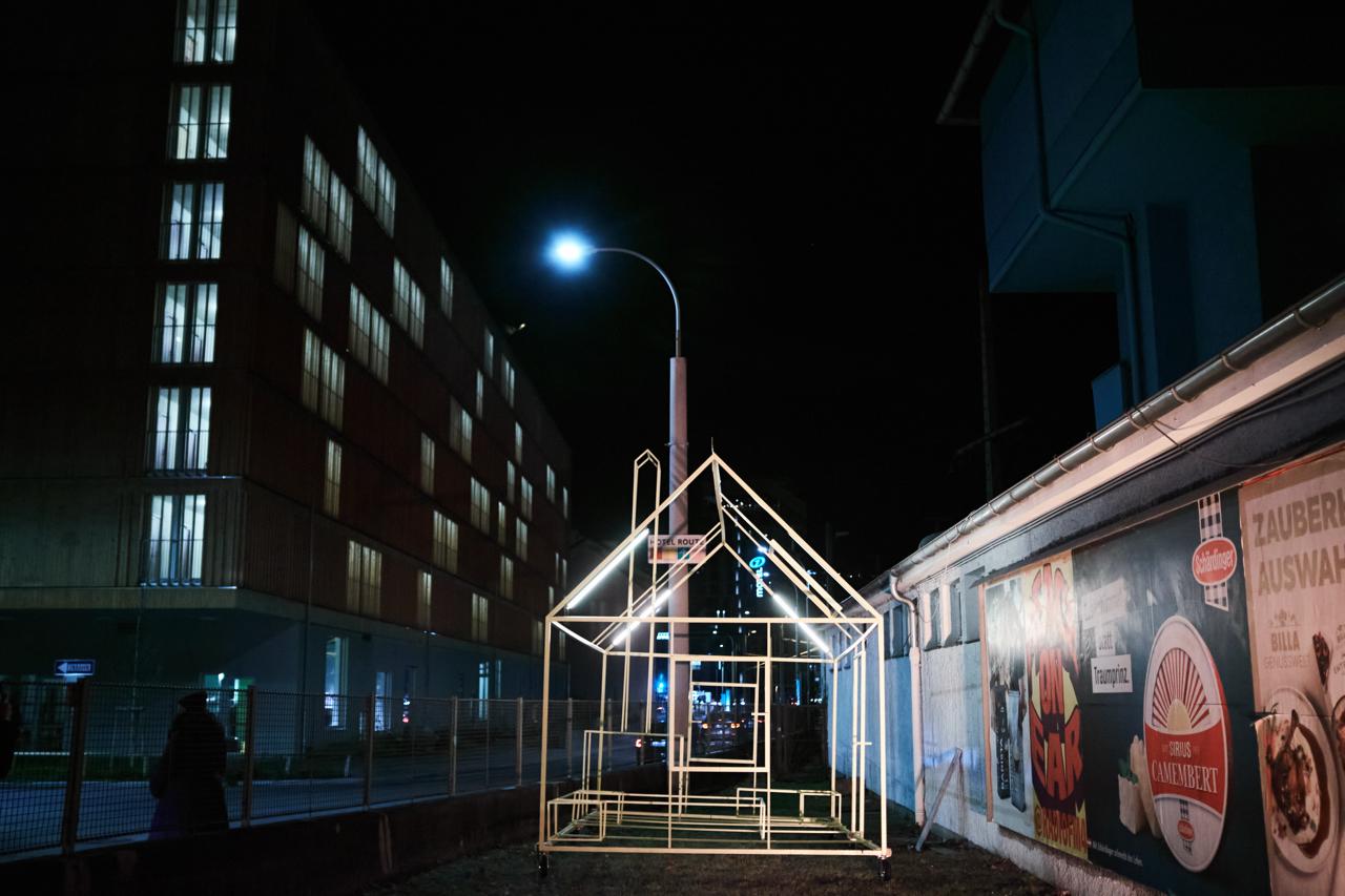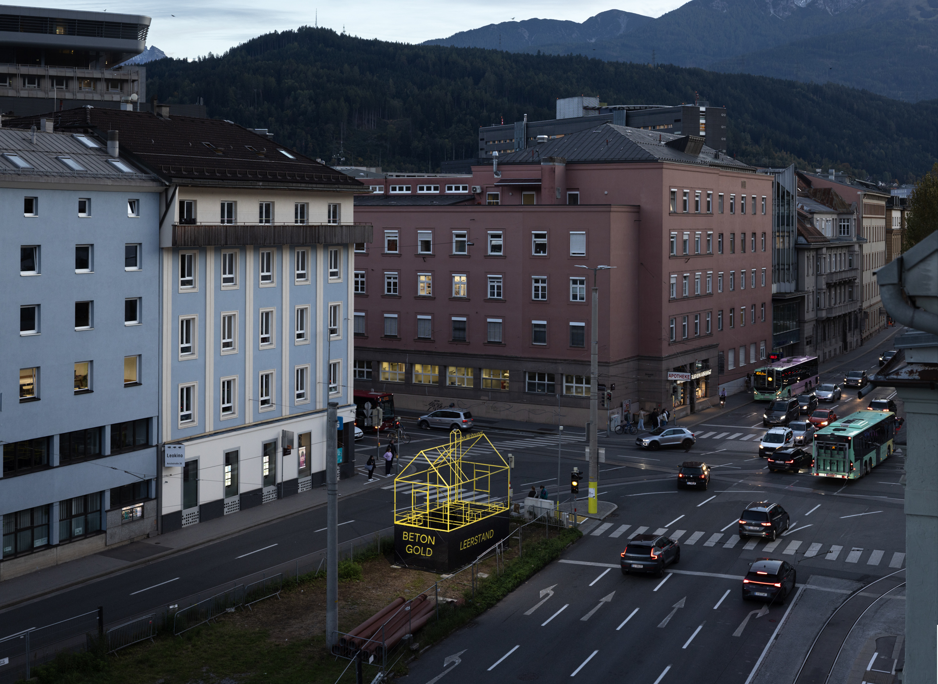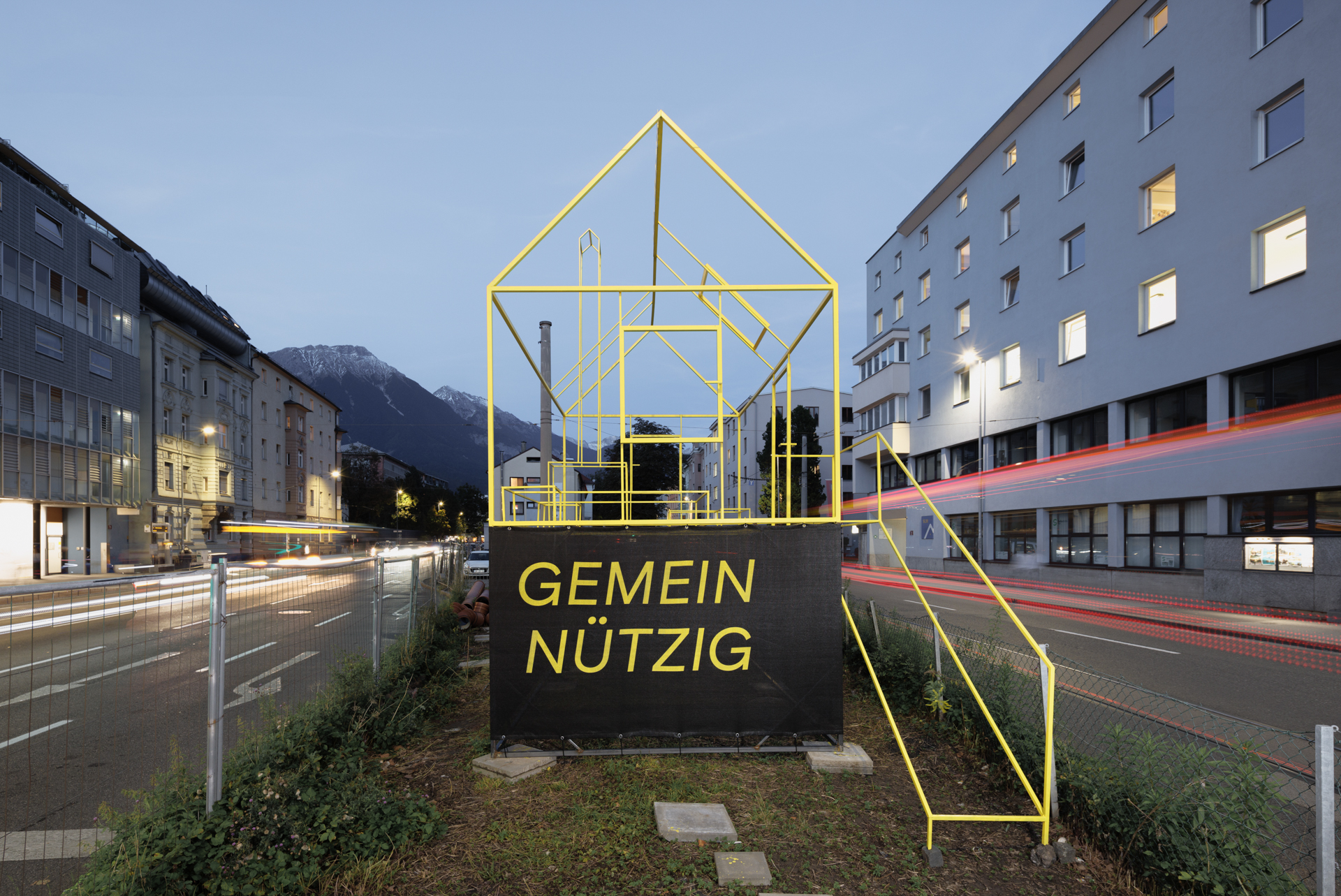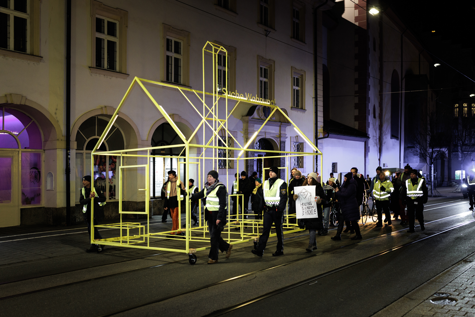 Das Satteldach unserer temporären Installation zeigt den ewigen Wohntraum der Innsbrucker:innen im Aufriss: eine Wohnung, die man bezahlen kann – oder gar ein Haus im Grünen.