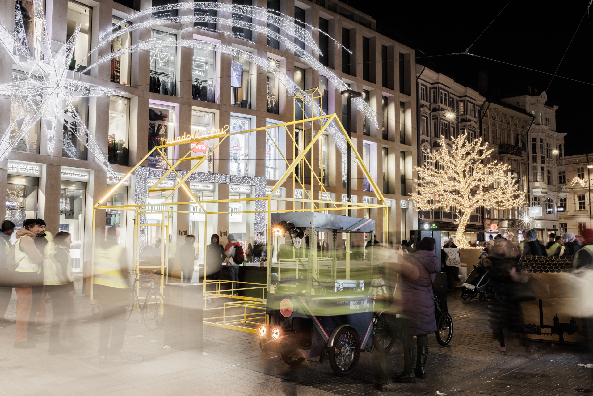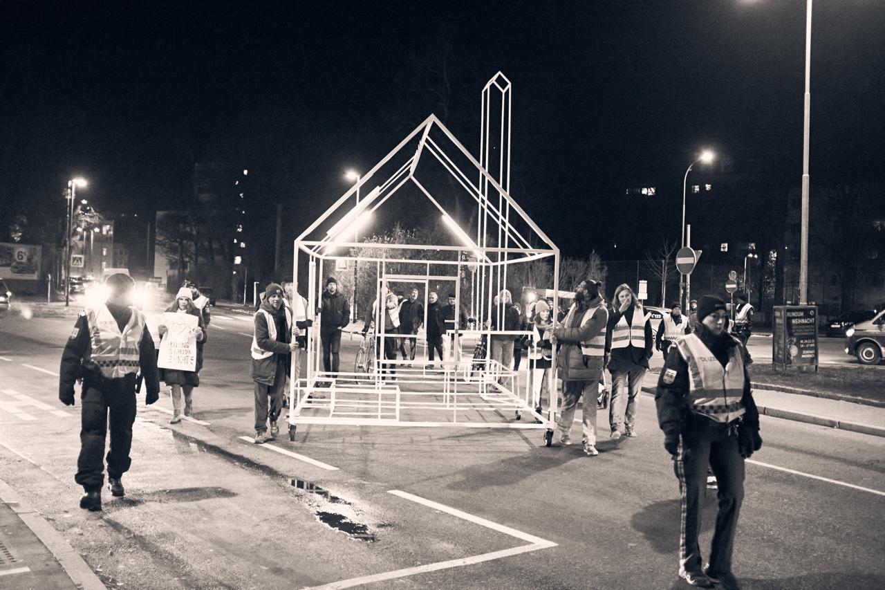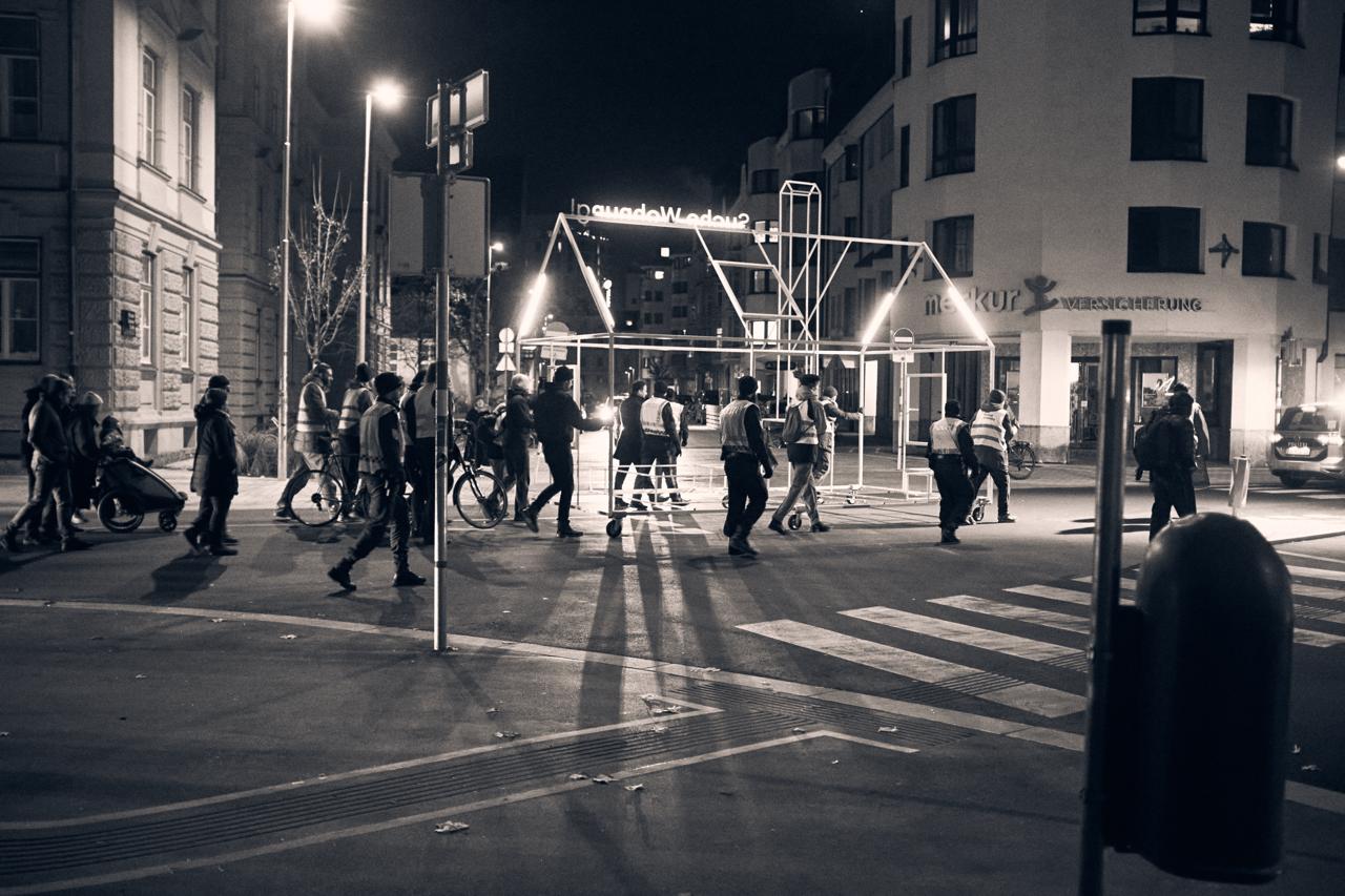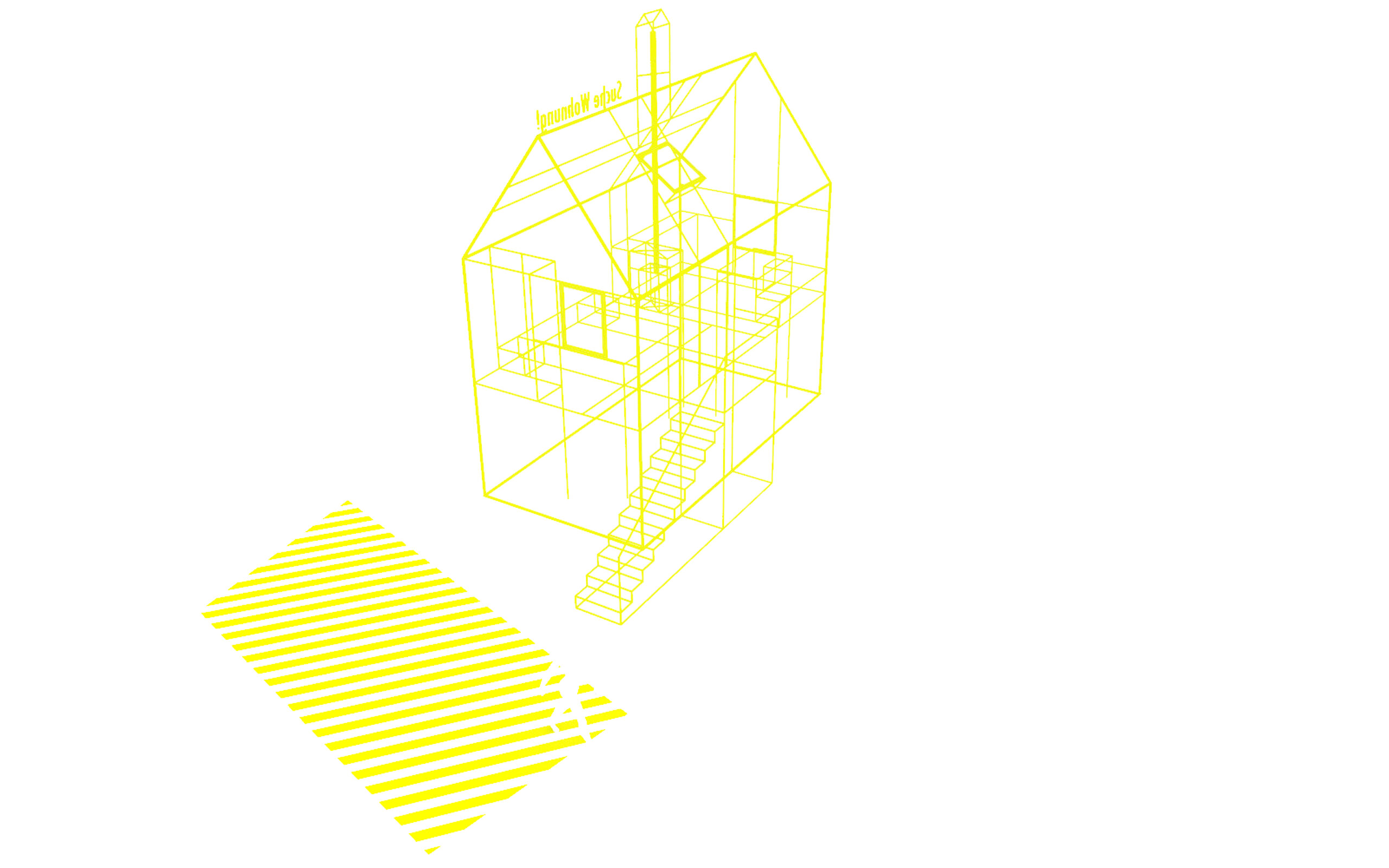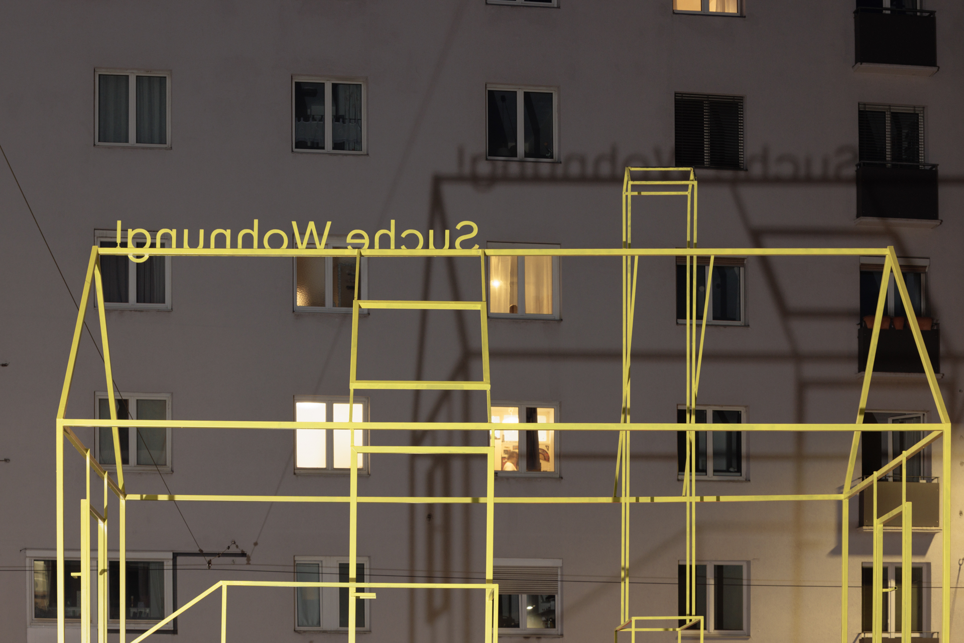 Das Satteldach unserer temporären Installation zeigt den ewigen Wohntraum der Innsbrucker:innen im Aufriss: eine Wohnung, die man bezahlen kann – oder gar ein Haus im Grünen.