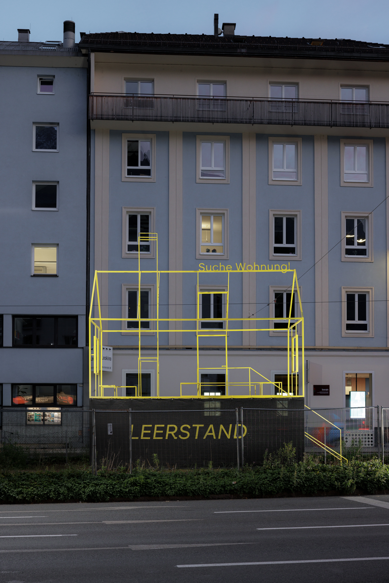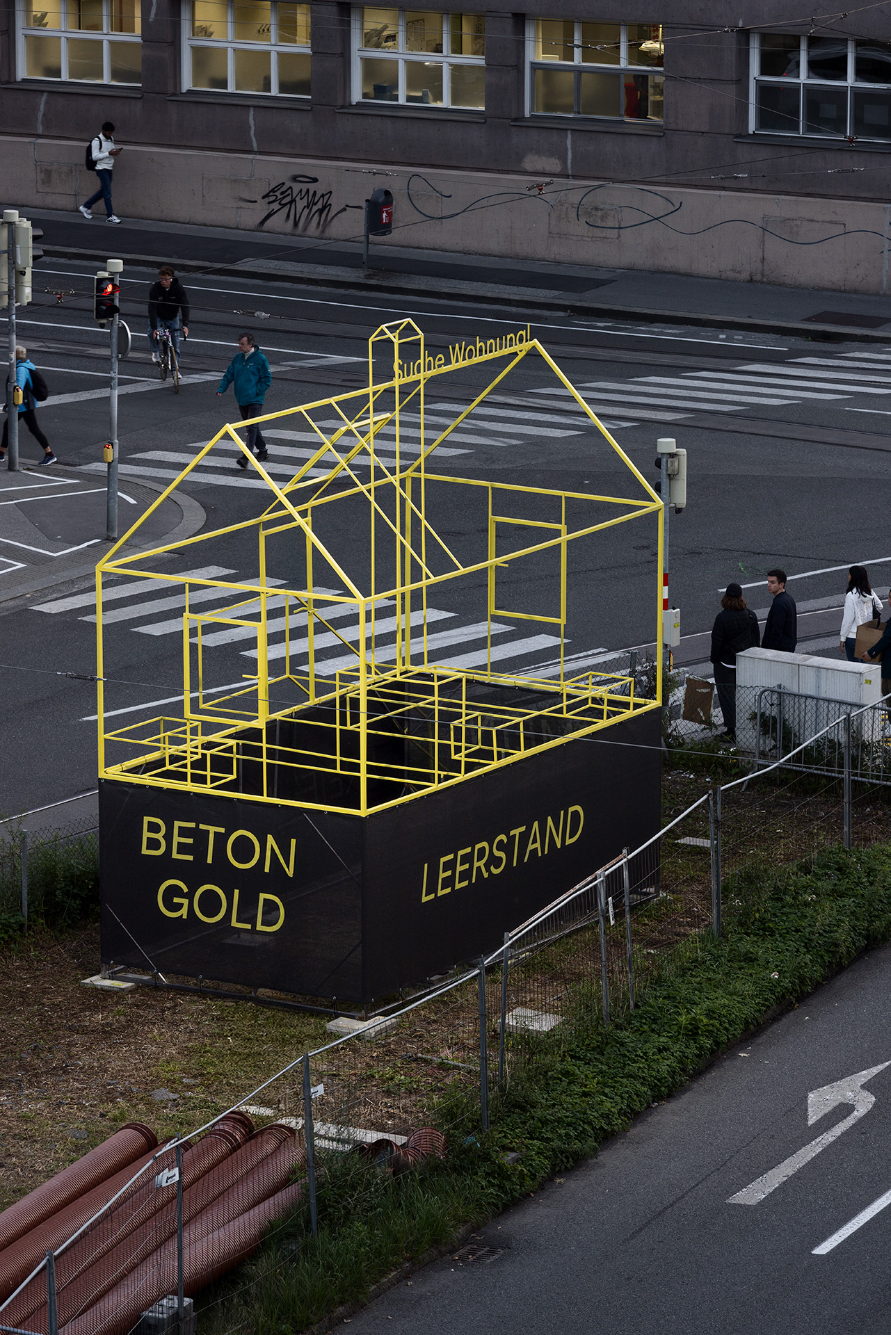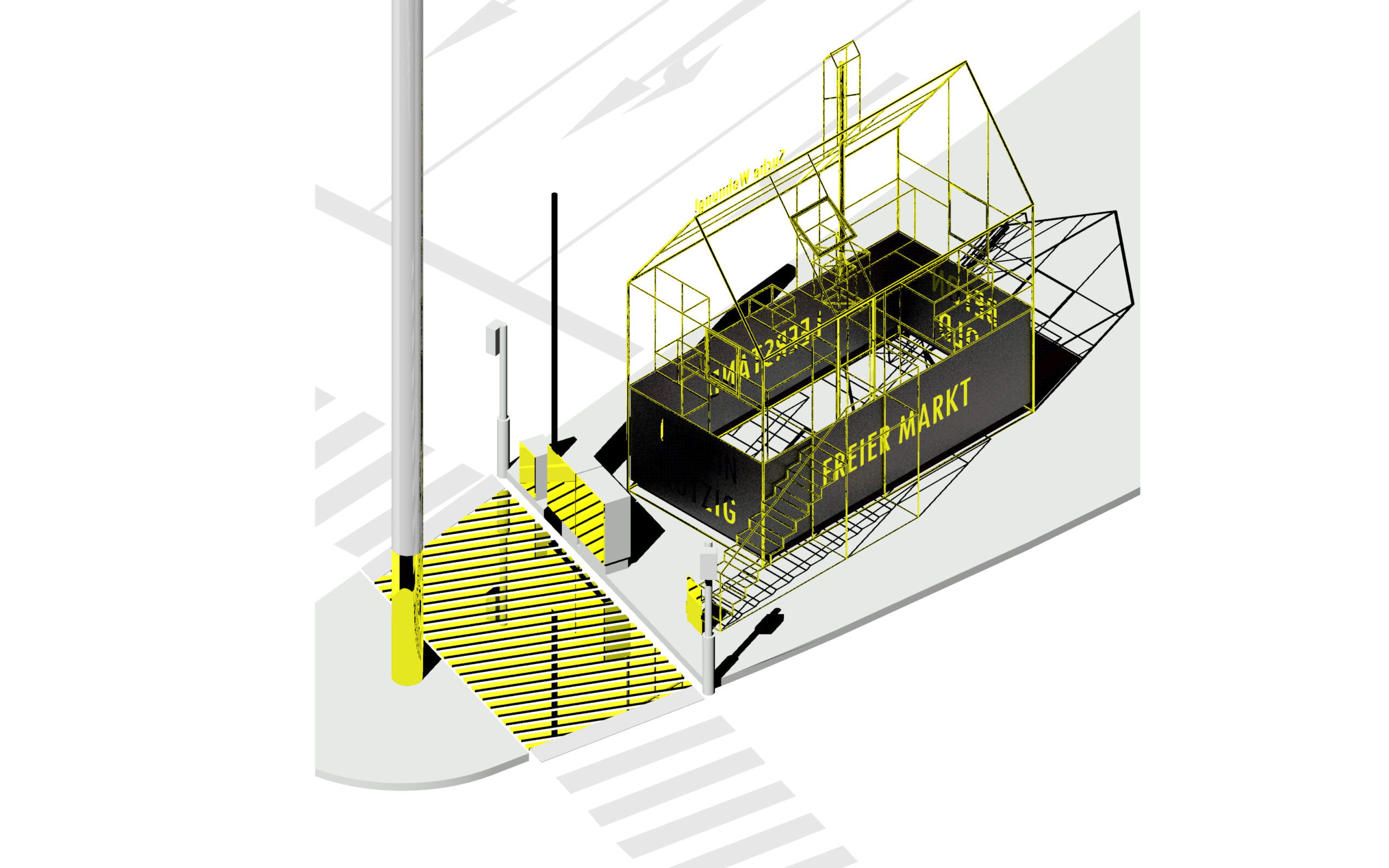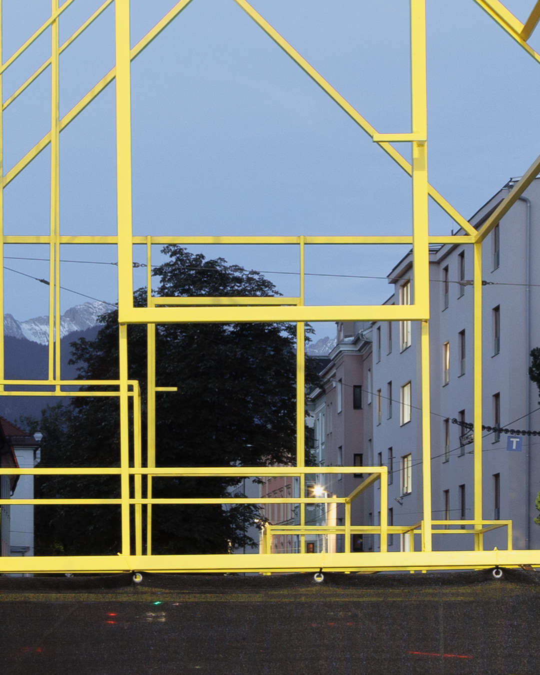 Das Thema wird nun in den öffentlichen Raum skizziert – die stählernen Linien lassen das Gebäude sichtbar werden, und doch ist es leer; da und doch nicht da.