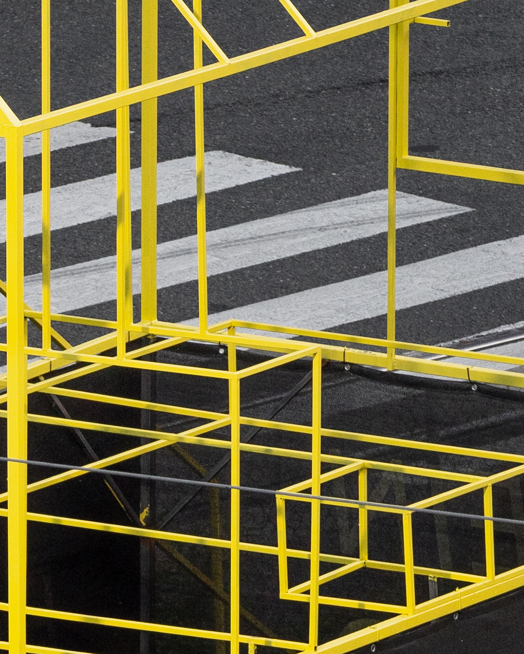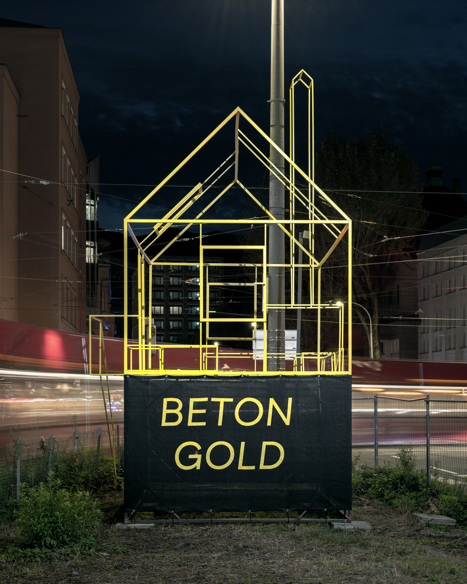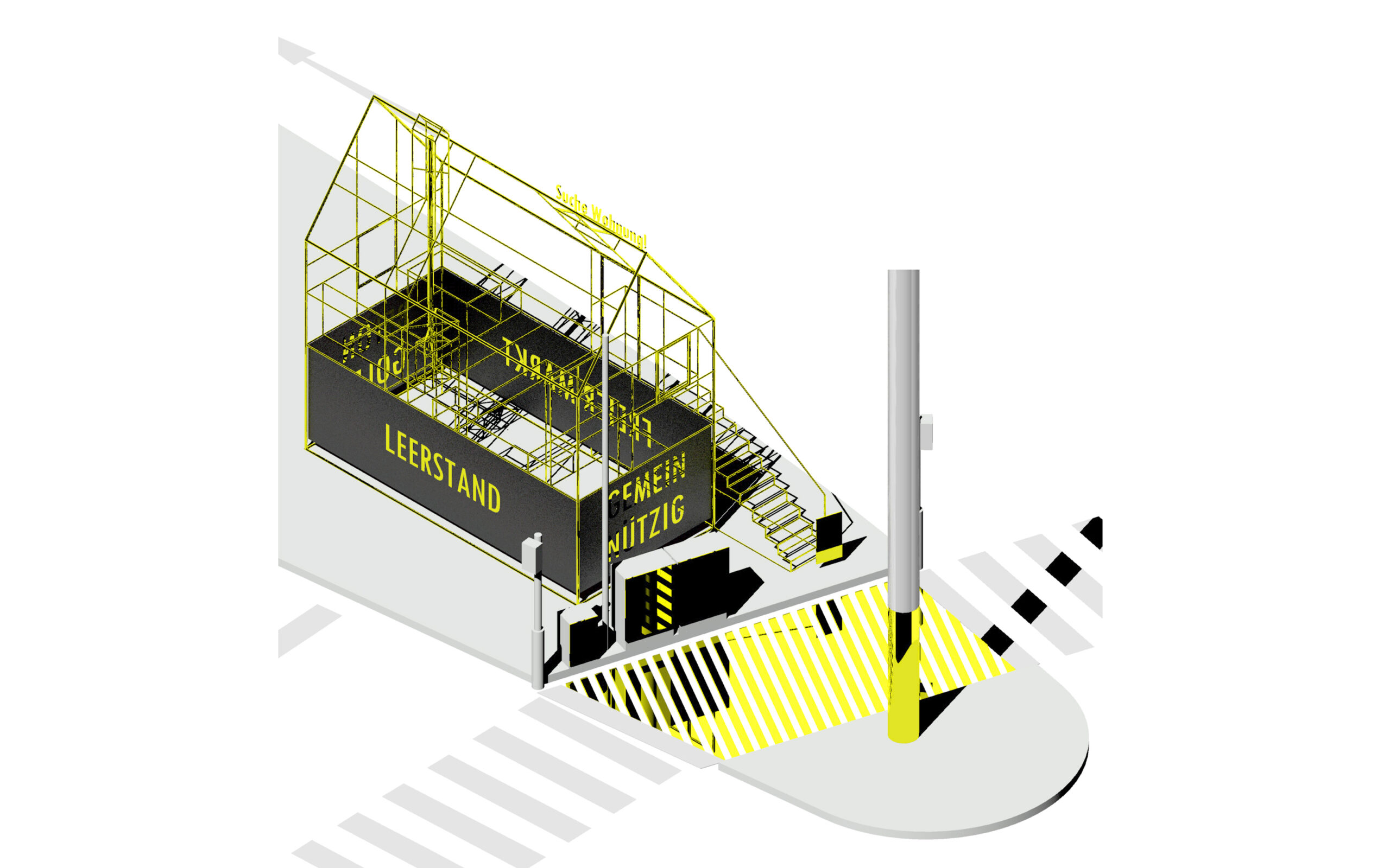 Das Thema wird nun in den öffentlichen Raum skizziert – die stählernen Linien lassen das Gebäude sichtbar werden, und doch ist es leer; da und doch nicht da.